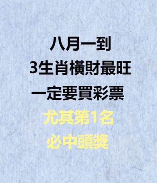 八月正式展開,財運磁場也悄然轉動!命理專家提醒,有三個生肖在這段期間「偏財運」特別旺盛,特別適合買彩票、抽獎、參與投資小博大的活動。尤其是榜首的那個生肖,更是被點名為「必中頭獎」的幸運王!快看看自己有沒有上榜!