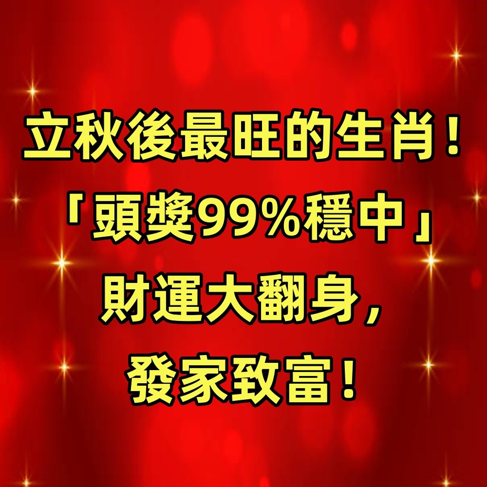 今天(8月7日)可不是普通的一天!立秋節氣撞上天赦日,這可是60年一遇的超級轉運日,被視為「天開恩門、地祈財路」的大吉之日。命理老師更直言:「今天是求財、求運勢的大好時機,特別是這幾個生肖,橫財運勢爆棚,有機會在威力彩中抱走頭獎!」