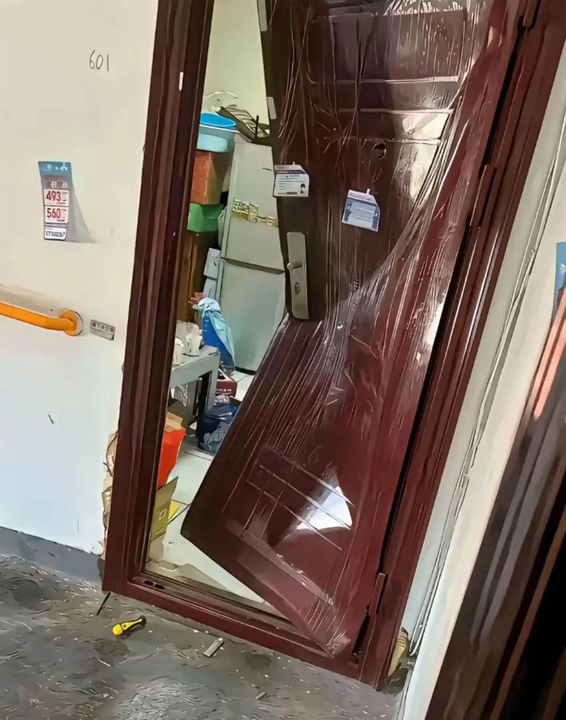周五晚上7點多,李小姐(化名)加班完拖著疲憊的身體回到家,剛踏出電梯就整個人愣住了——自家防盜門竟然整個變形,門框開裂、鎖芯歪掉,看起來就像被人用力踹過!