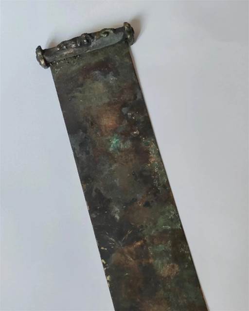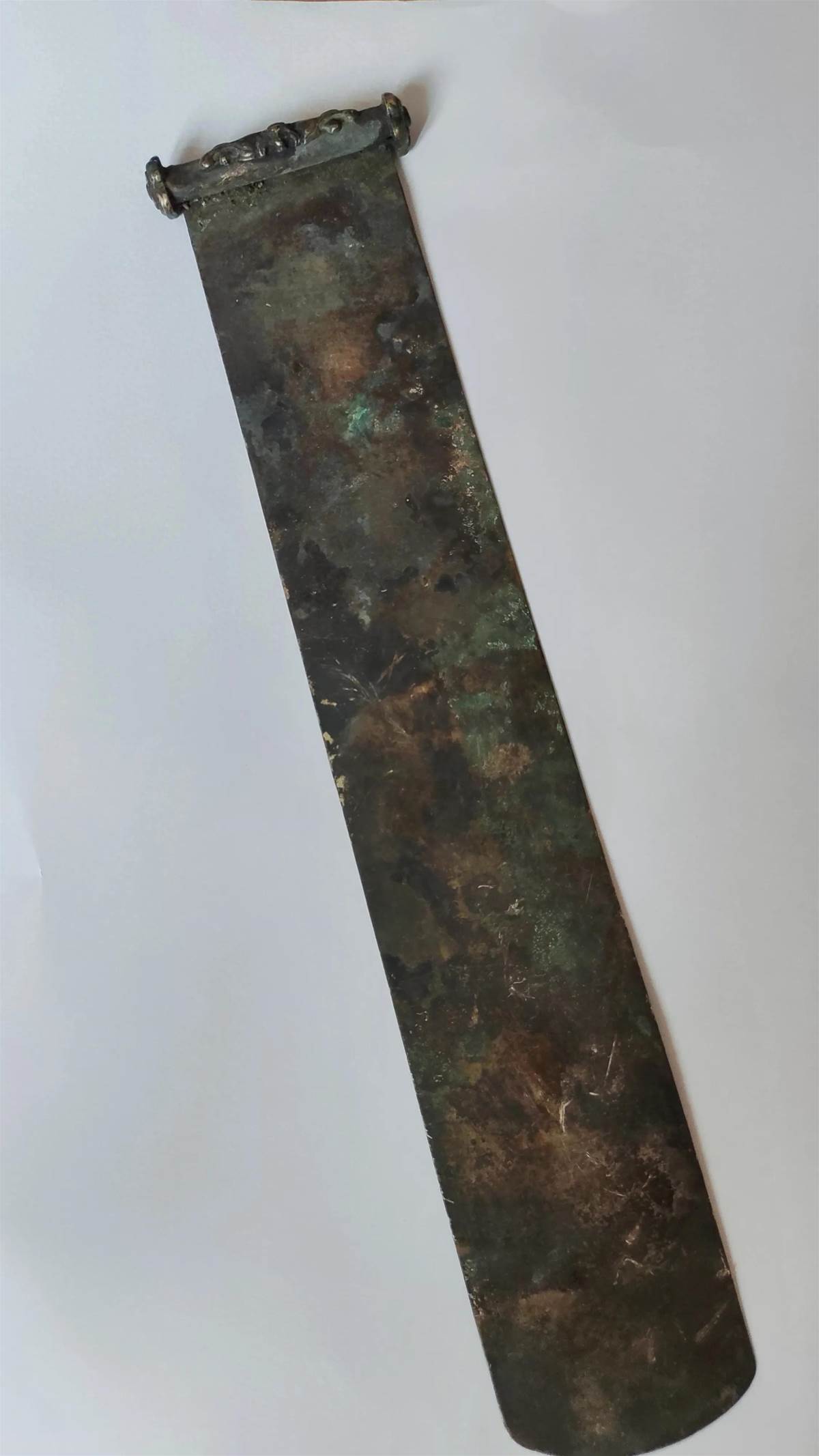 媽媽過世後,我開始整理她的遺物。翻到衣櫃最底層的樟木箱時,掀開一層層泛黃的舊衣服,底下壓著一個用紅布包起來的長條形東西。打開一看,是一片黑漆漆的金屬,長大約30公分、寬4公分,表面佈滿氧化後的銅綠,邊緣還有點磨損。