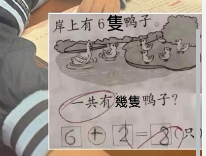 一位媽媽最近在社交媒體上分享了自己的尷尬經歷:她的兒子做了一道題:岸上有6只鴨子,水中有兩只鴨子,那麼總共有幾只鴨子?孩子寫下「6+2=8」,結果被老師打了個大紅叉。