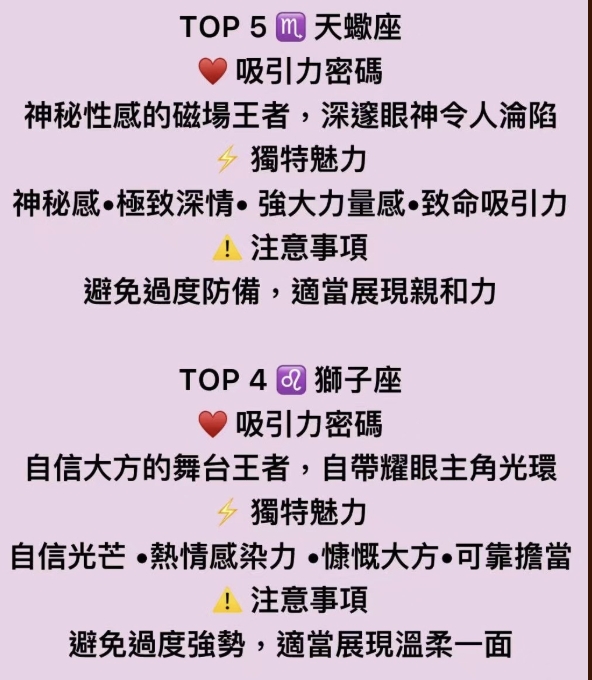 解析:天秤喜歡談戀愛,也懂得浪漫。但因害怕衝突,有時會拖延決定。姻緣數量中等,最終會選擇與自己契合的人。