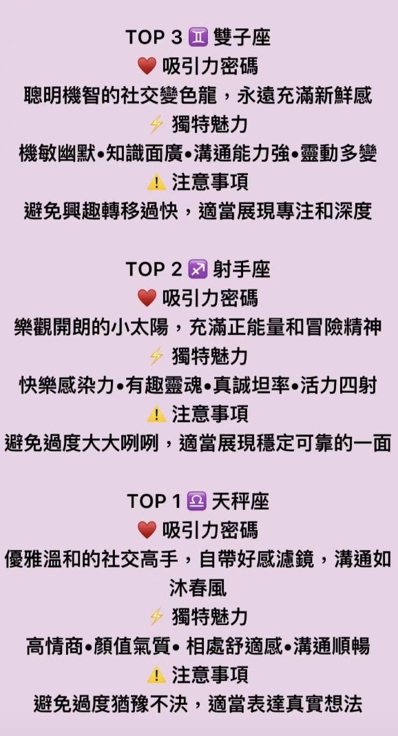 解析:雙子容易被新鮮感吸引,年輕時感情多彩多姿,分合也較頻繁。成熟後會挑選與自己思想契合的人,姻緣質量逐漸提升。