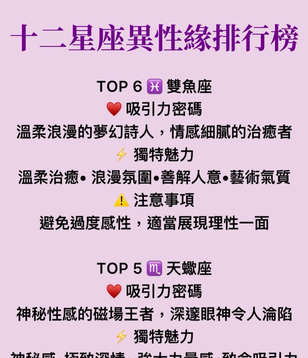 解析:雙魚容易被情感打動,常陷入不切實際的愛情幻想。姻緣雖多,但需要學會選擇和看清真心的人。