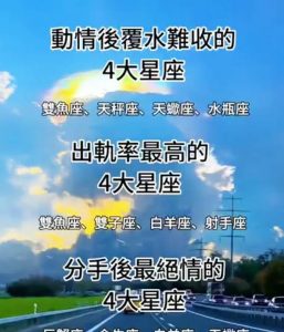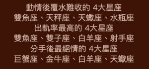 九月最容易被孽緣纏身的四大星座分別是 雙子、天蠍、射手、雙魚。雖然感情來臨時很難抗拒,但更要保持理性,別因一時心動而讓自己受傷。若能看清真相、果斷止損,才能擺脫孽緣,迎向真正的幸福。