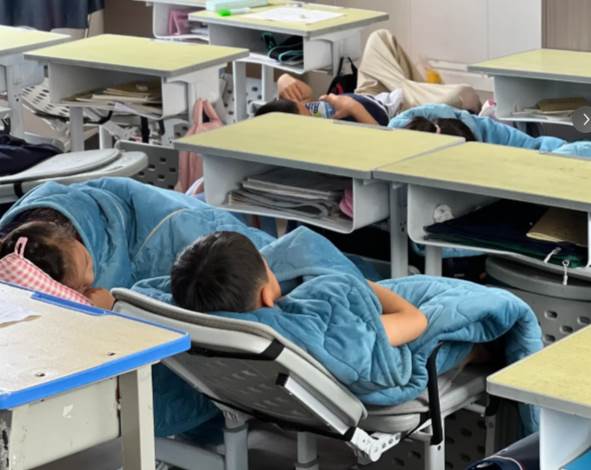 有人分享不同作法:「我家小孩學校會把後排桌椅移開,鋪墊子直接躺地上睡」;還有「硬核家長」爆料:「有同事乾脆在學校旁邊的連鎖旅館長租房間,專門給孩子午休用,還包午餐、冷氣、叫醒服務」。