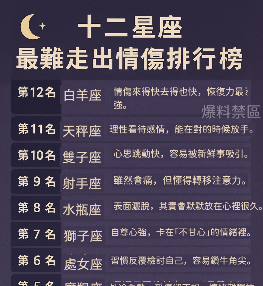 第12名 白羊座:情傷來得快去得也快,恢復力最強。