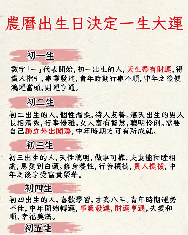 農曆出生日期,揭示了一個人天生的性格與運勢走向。雖然日子影響命格,但後天努力與心態同樣重要。若能順勢而行,避開缺點、發揮優點,每一天出生的人都能擁有屬於自己的精彩人生。