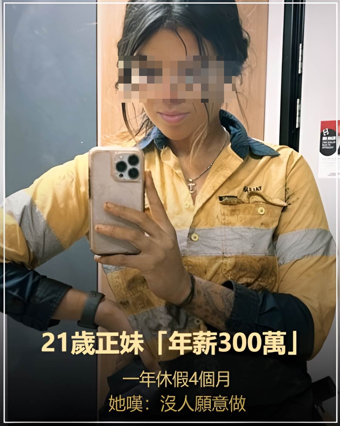 根據外媒報導,來自澳洲西澳州珀斯(Perth)的 21 歲女子珍(Taleah Jayne)分享,她目前在礦坑裡擔任輪胎維修實習生,年薪高達 8 萬英鎊(約新台幣 317 萬元),而且一年能放長達 4 個月的假。隨著經驗累積,薪水還會再往上調。