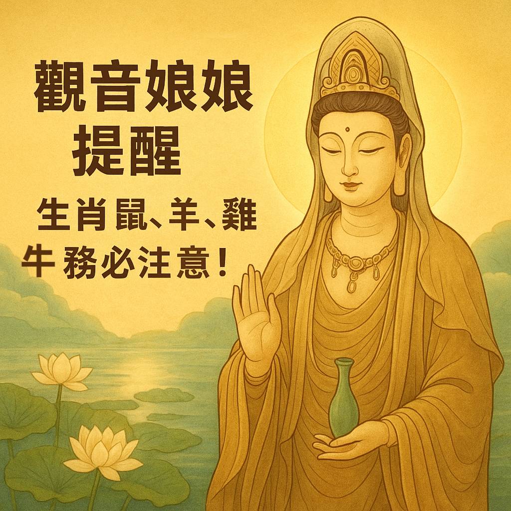 觀音娘娘慈悲為懷,循聲救苦。祂提醒以下四個生肖的朋友們,在接下來的這段時間裡,雖然運勢上會有些許波動與挑戰,但只要心存善念、行事謹慎,便能獲得菩薩的庇佑與指引,最終逢凶化吉,轉危為安!