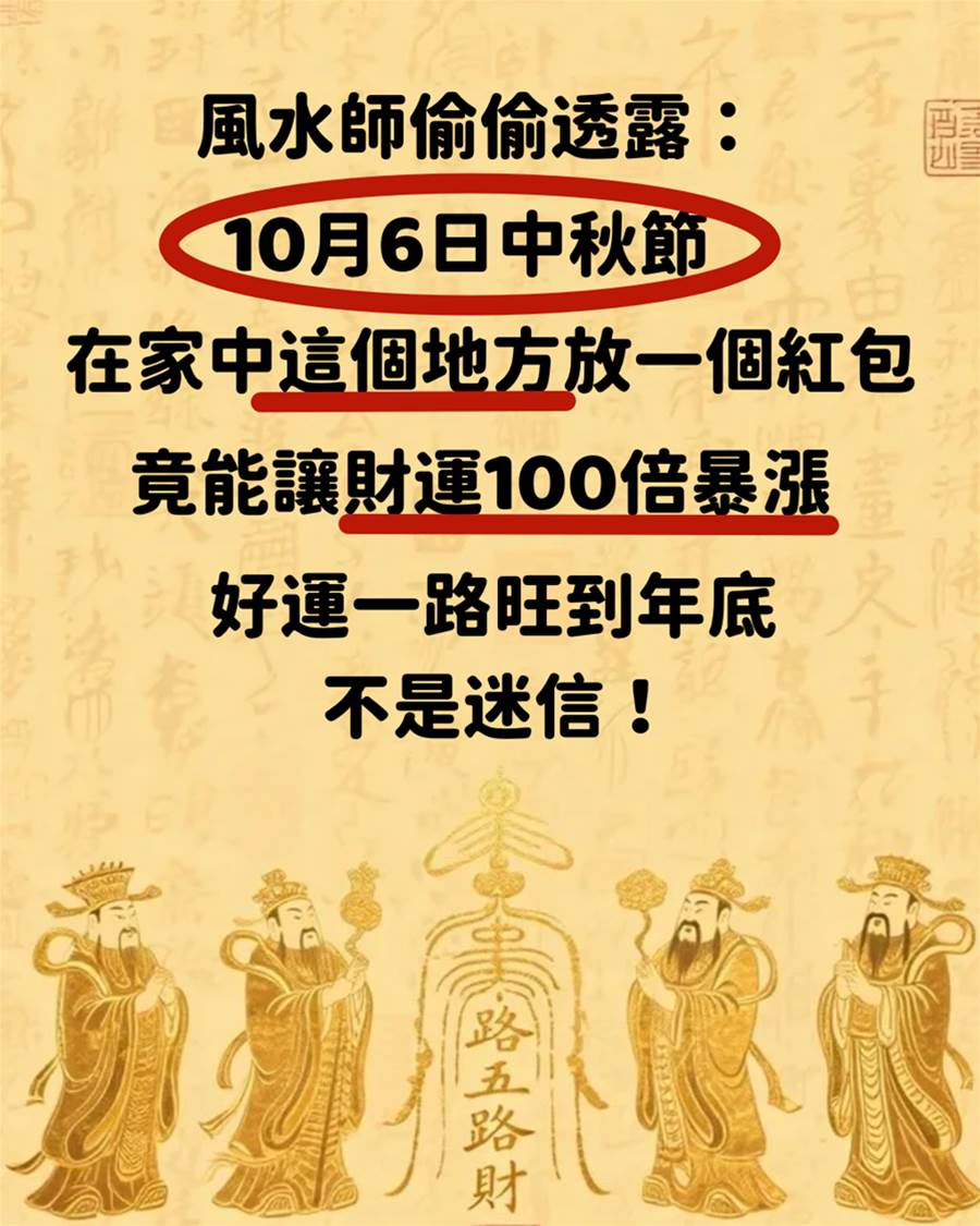 風水師偷偷透露:10月6日中秋節在家中這個地方放一個紅包,竟能讓財運100倍暴漲,好運一路旺到年底
