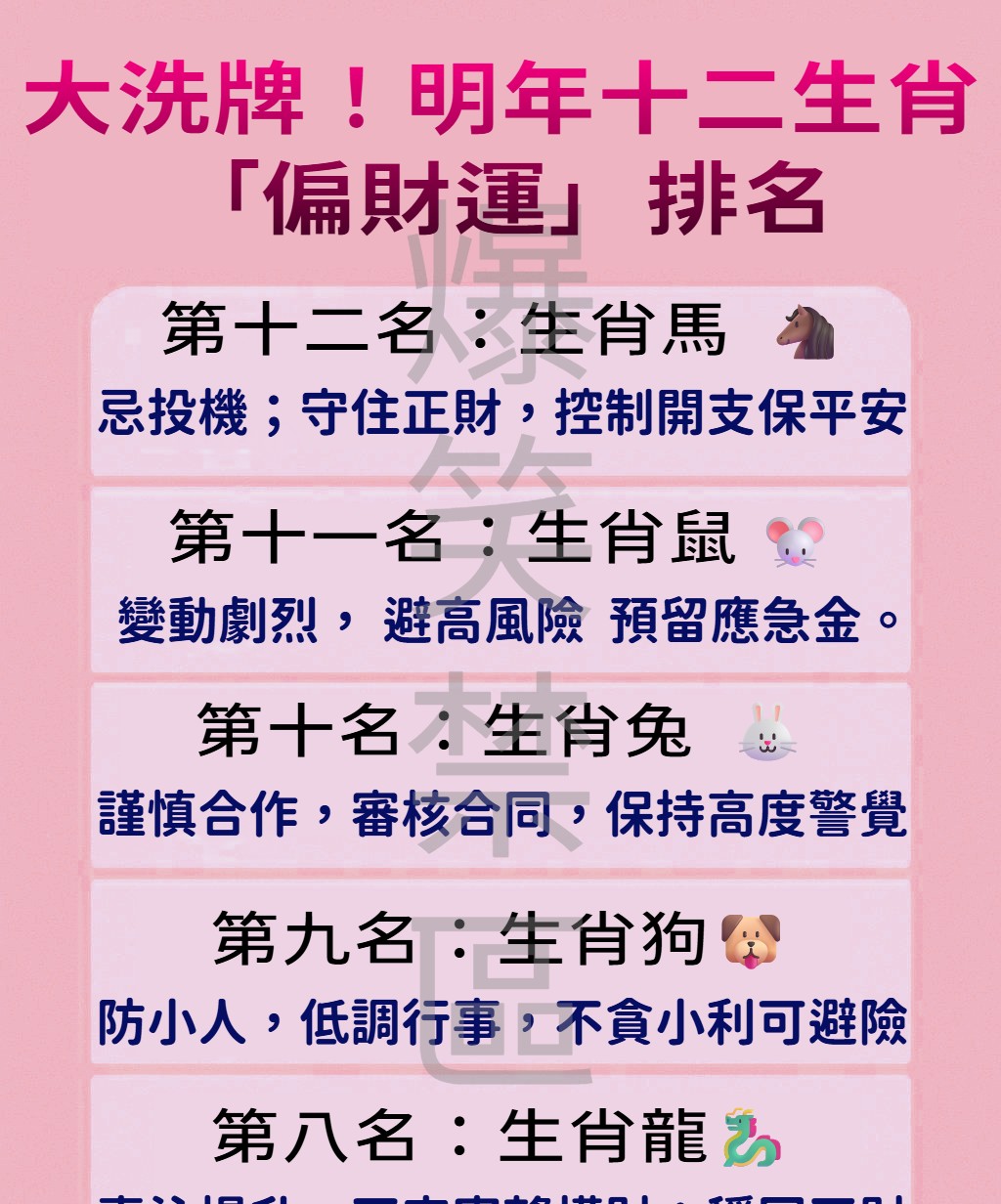 2026 丙午火馬年,運勢波動極大,偏財市場將迎來一場徹底的洗牌!以下從最需注意的第 12 名開始,依序揭曉您的偏財運勢,讓您能趨吉避凶,精準理財: