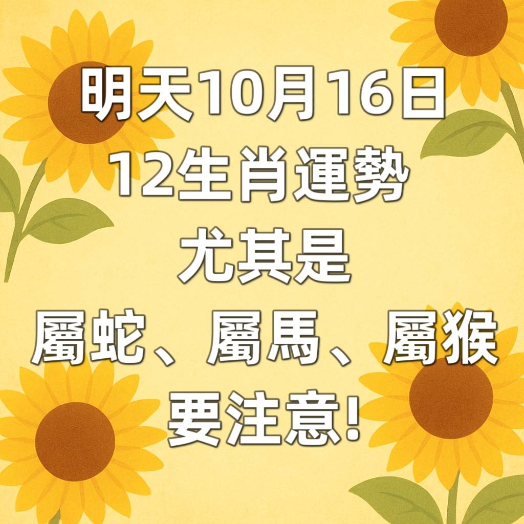 本日重點星象: 2025 年 10 月 16 日為乙亥日,亥水能量強勁,對屬水的生肖(鼠、豬)和三合貴人生肖(兔、羊)多有助力。本日運勢將以「穩定人際」和「謹慎行事」為主要課題。