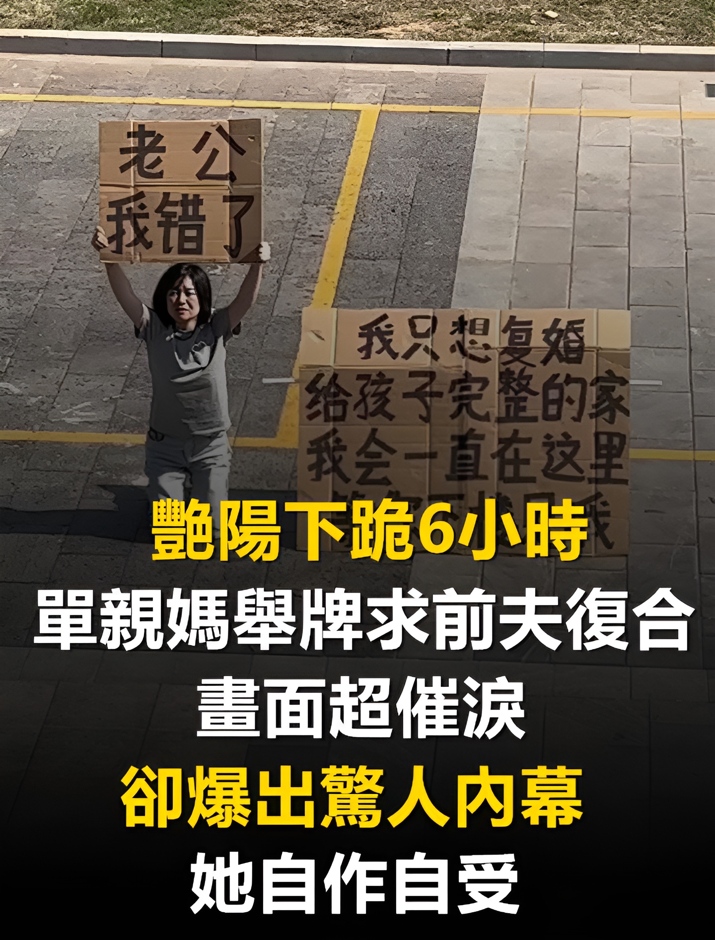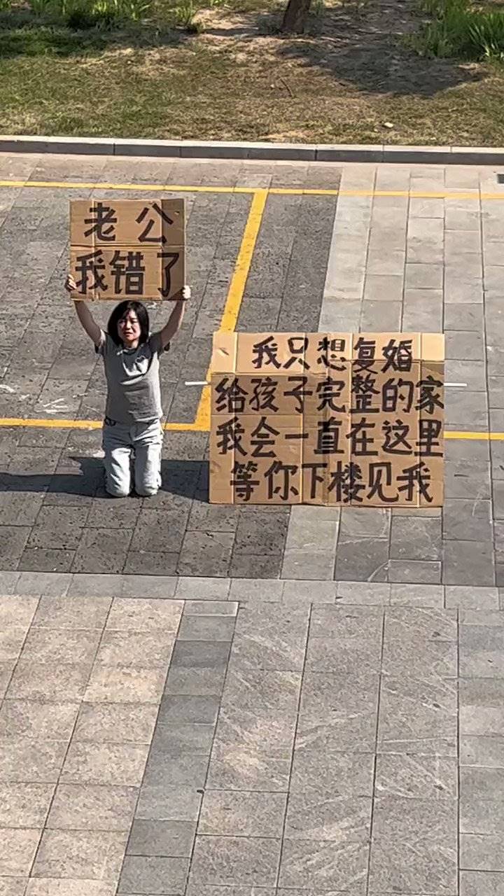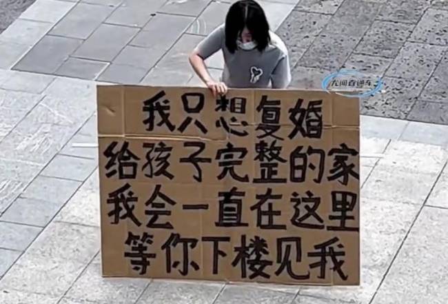 只見標語上寫著「我只想復婚,給孩子完整的家,我會一直在這裡,等你下樓見我」據傳這位女子在豔陽下站了6小時,時而舉牌喊著前夫名字,時而跪下苦求對方見她一面,悲情的身影讓網友看了都十分不捨,沒想到前夫竟出面爆出了超反轉的劇情!