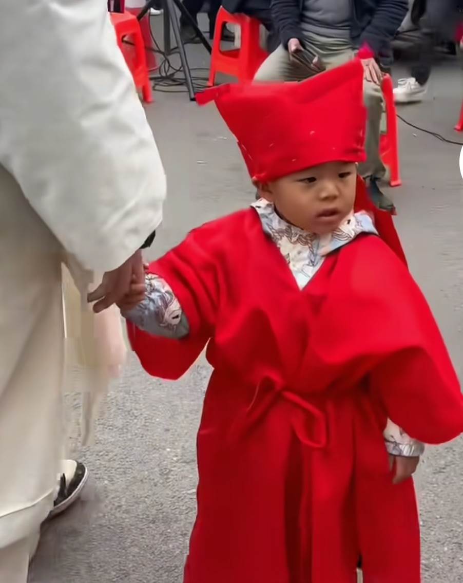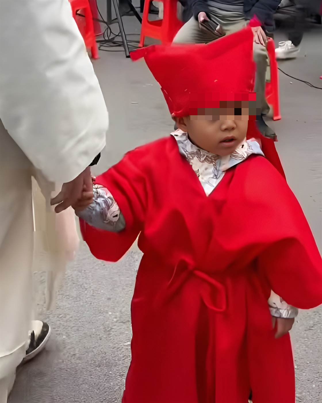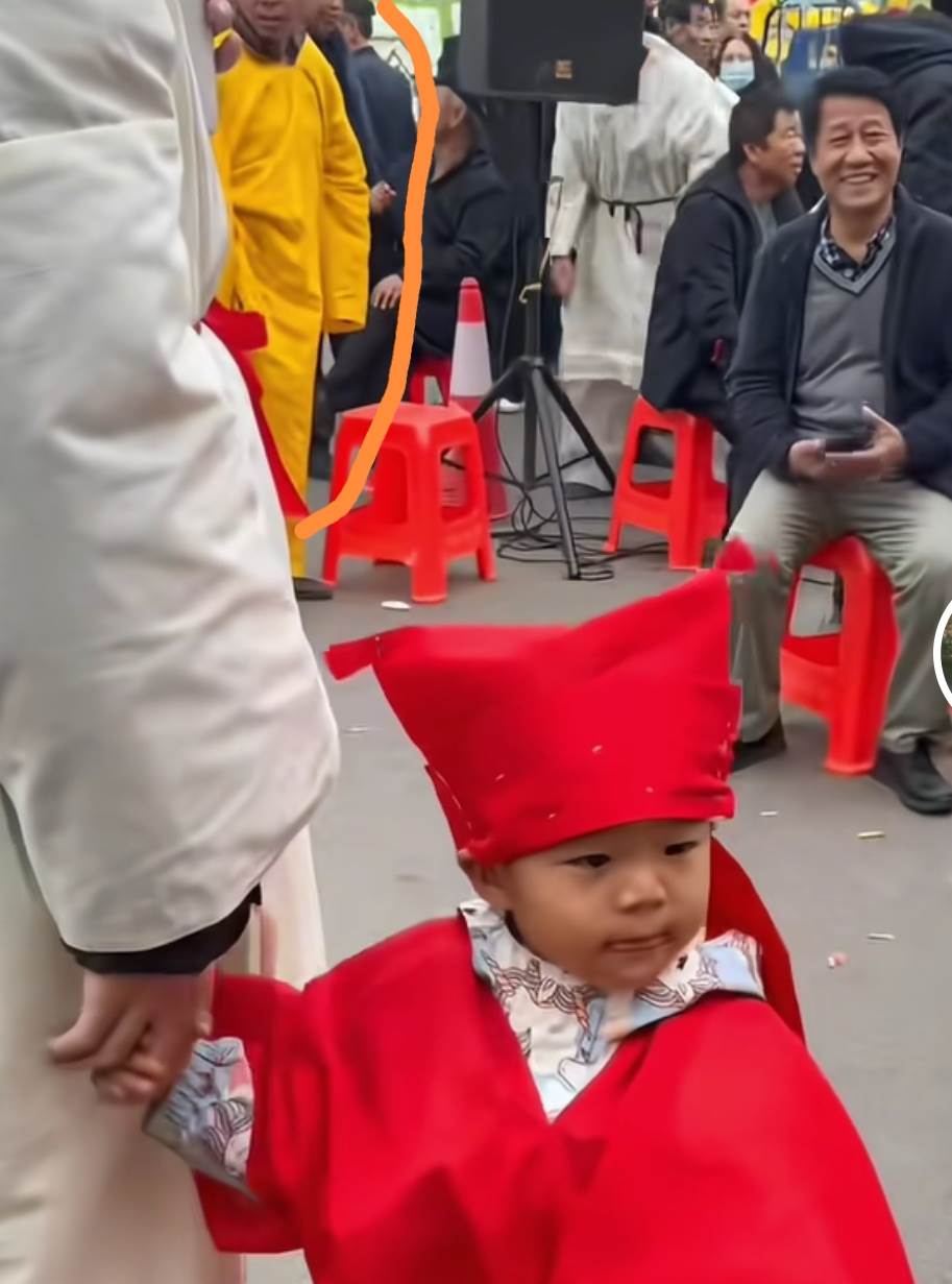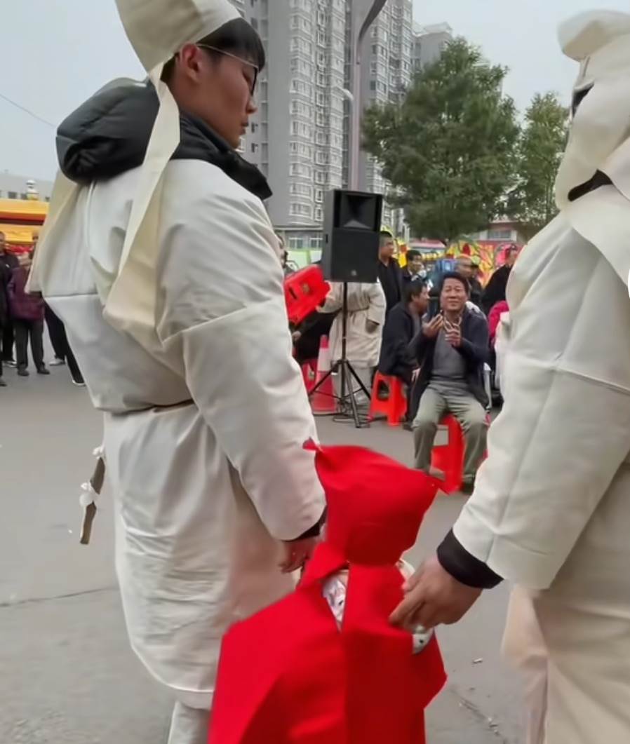 不過,在一片白色孝服的人群中,卻有幾個人特別顯眼——有人穿著黃色孝服,甚至還有個小孩穿紅色孝服。這畫面讓不少人看傻了眼,心裡想:「葬禮穿紅色?這不是很不吉利嗎?」