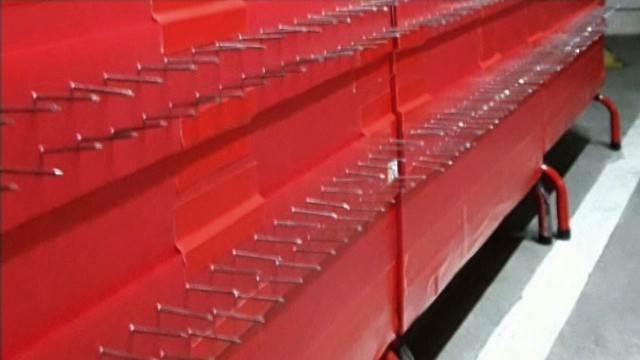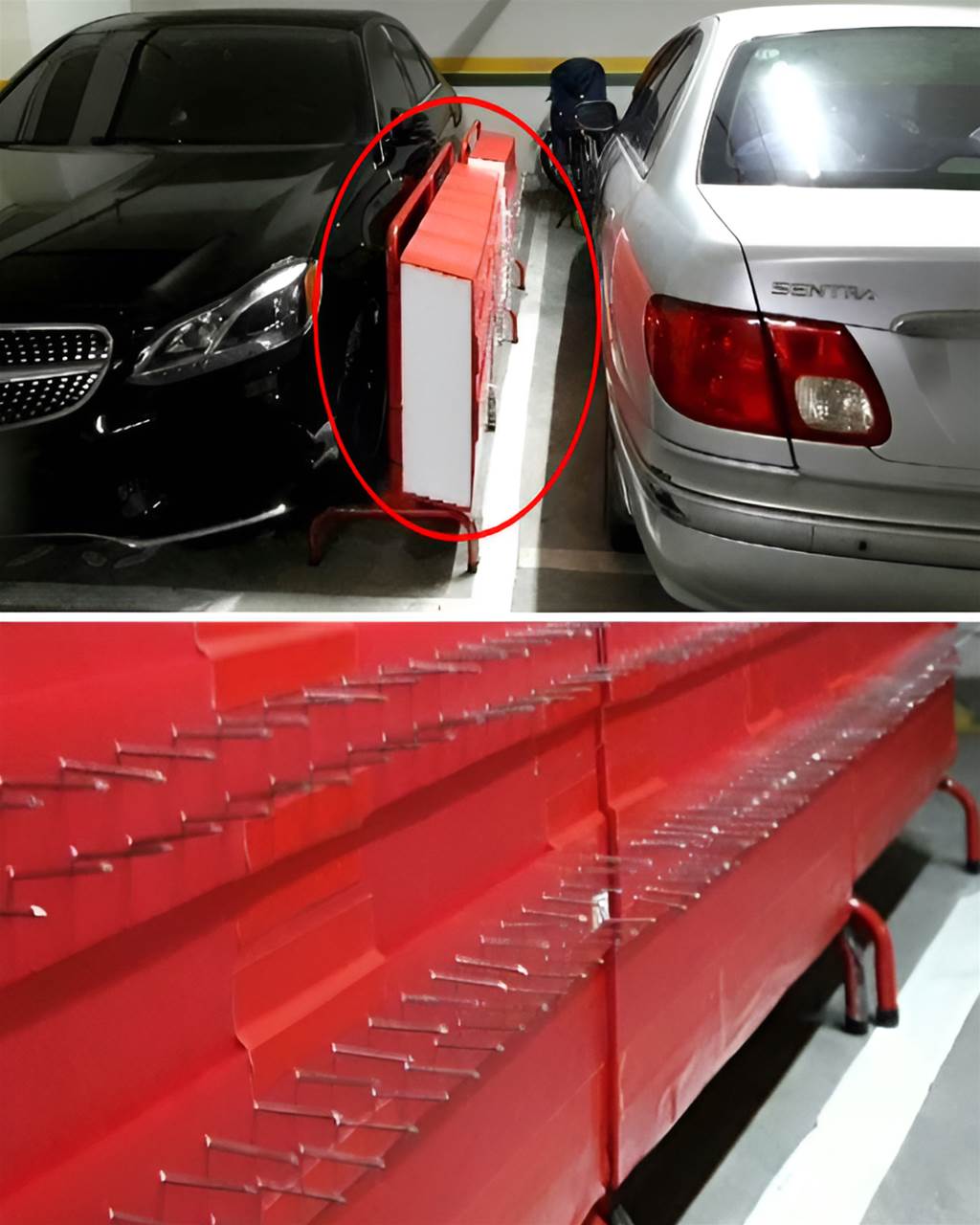 上面還密密麻麻插滿長鐵釘,一不小心碰到就會刮花車門!