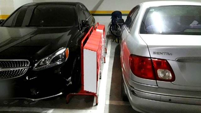 原本兩車之間的空隙,竟被賓士車主立起一整排紅色鐵板釘牆,