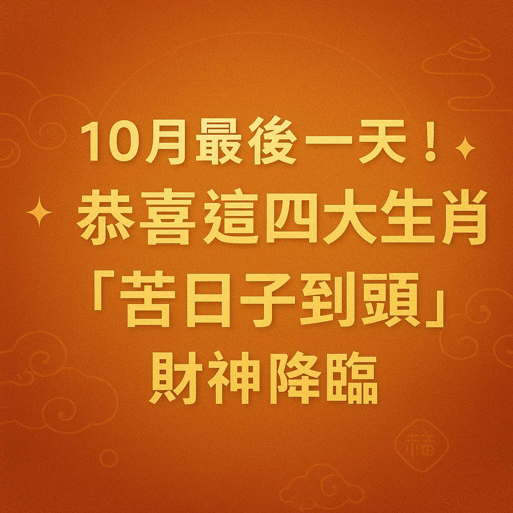 是本月的最後一天,也是承接金秋財氣、準備邁入冬季豐收的關鍵轉運點。有四個生肖在過去這段時間可能經歷了工作上的壓抑、資金上的吃緊,或是付出與回報不成正比的「苦日子」。