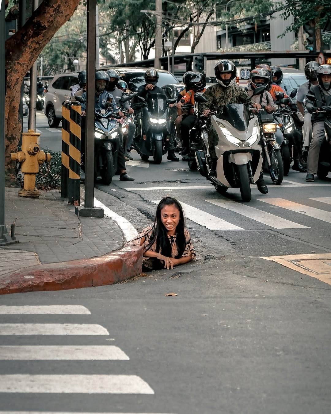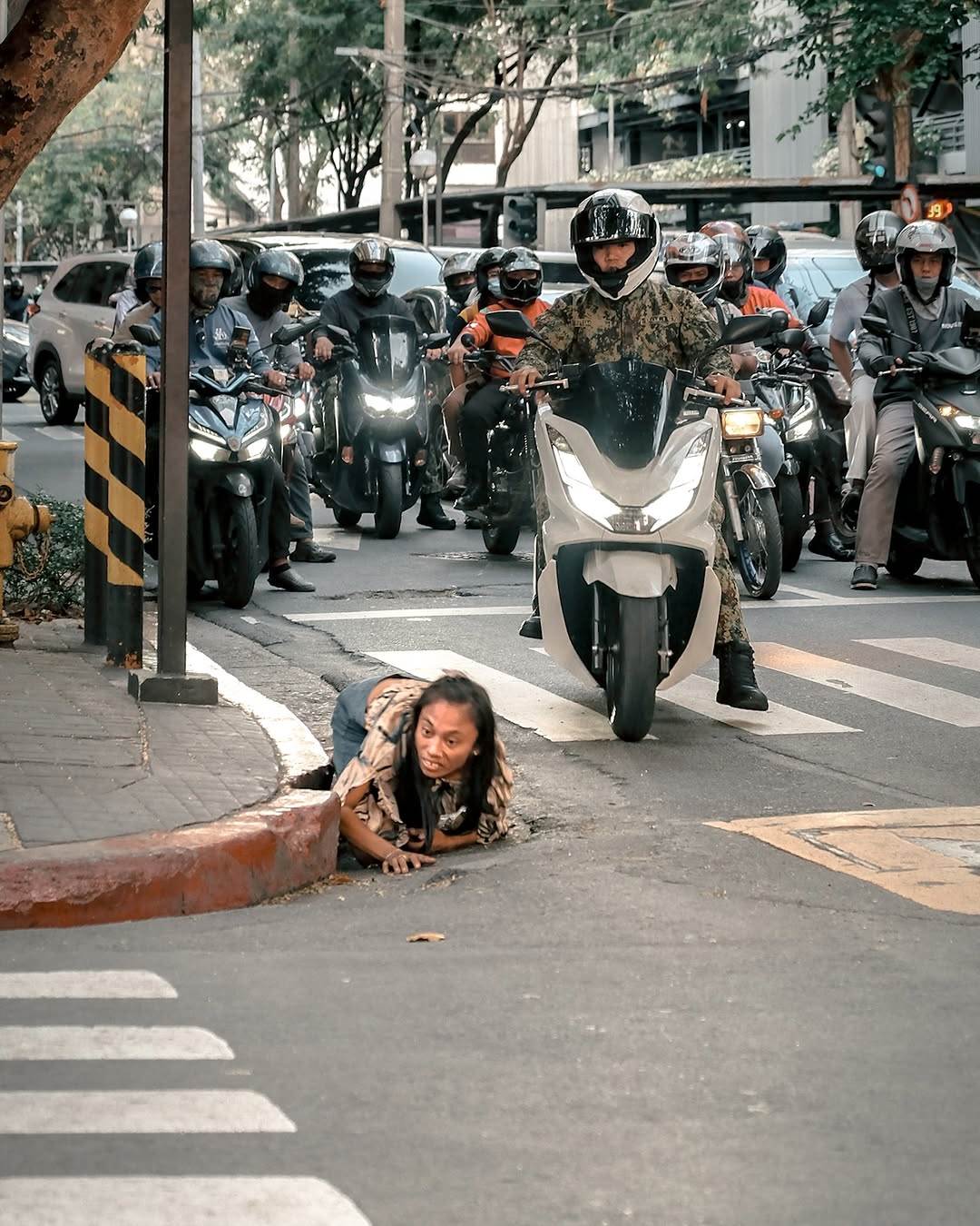 菲律賓馬尼拉馬卡蒂市(Makati)街頭日前出現離奇一幕,一名長髮女子竟從市區馬路旁的排水孔「慢慢爬出」,畫面宛如電影場景,讓路過民眾全看傻,現場騎士更是嚇到倒退、直呼「以為遇到靈異事件」。