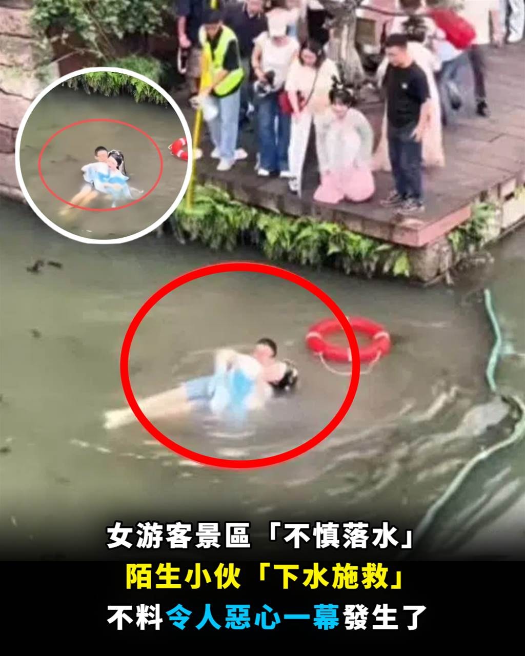 近日網路上流傳一段影片,引起不少討論。畫面中,一名身穿古裝的女遊客在景區拍照時,疑似一個不穩,不慎滑入河中。岸邊民眾驚呼連連,場面一度混亂。就在眾人慌張之際,一名年輕男子立刻跳入水中,試圖協助女子脫困。