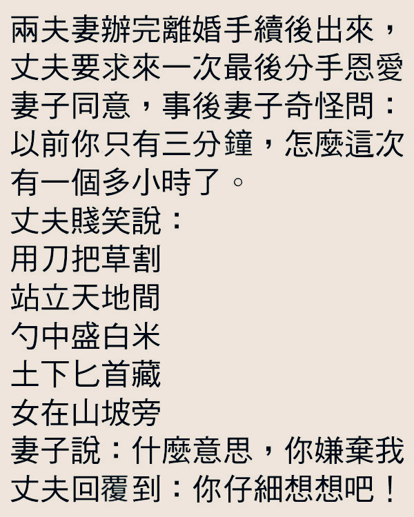老:土下匕首藏(“老”字下部的“匕”,上面可看作類似“土”的變形,謎面描述其字形結構 )
