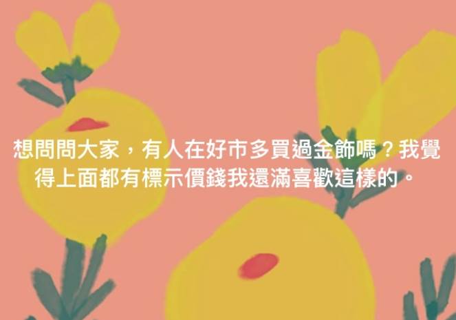 該網友表示自己經常光顧好市多,看到賣場中琳瑯滿目的金飾標價透明,讓她心生好感,于是她好奇地詢問其他會員:「有人在好市多買過金飾嗎?」
