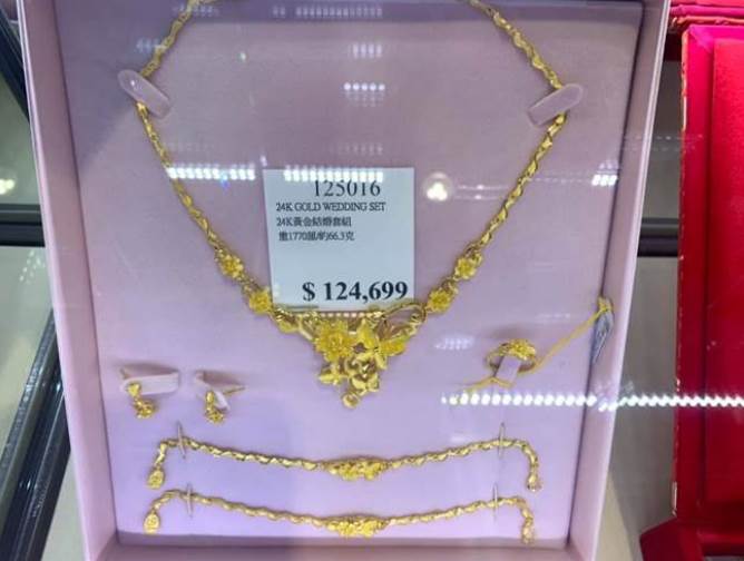 好市多賣場內,金飾琳瑯滿目,從華麗的24K金婚禮套裝到高價的金磚,價格標籤也一目了然。例如一套24K金婚禮套裝,標價高達新台幣124,699元,而一塊24K 999.9的金磚則售價約為61,579元。