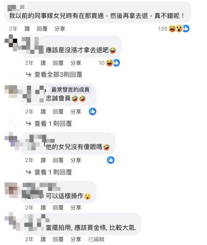 他透露自己的同事在女兒結婚時,曾經在好市多購買金飾,結完婚后便將金飾退回,并且順利拿到了退款。