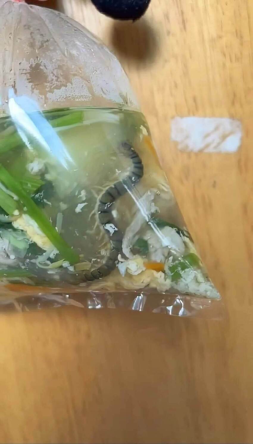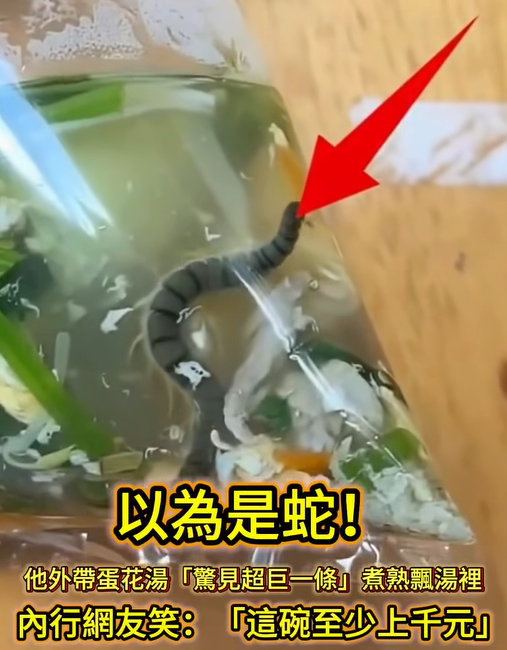原PO公開的照片中,發現在塑膠袋中應是裝著蛋花湯,但仔細一看,裡面竟有一條分為數節、形狀似蛇的動物屍體,讓他一瞬間頭皮發麻,原PO崩潰寫道,「這應該不是冬蟲夏草了吧?」文章曝光後,也馬上引來大批網友朝聖、留言。