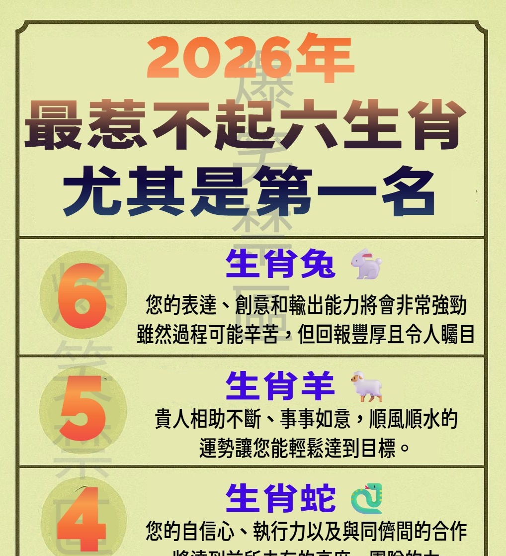 明年是充滿爆發力的 丙午火年,這股強火能量將為與其相合或相生的生肖帶來極致的動力和資源。這六大生肖將會是明年運勢最盛、最難以阻擋的贏家!