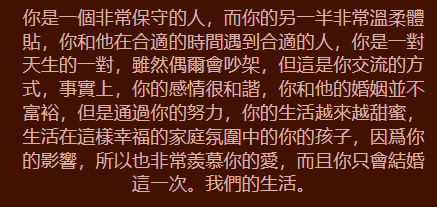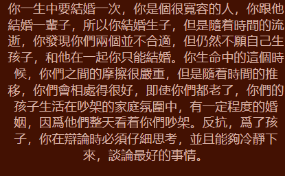 挑選B:你的心計一般般,你是一個性格內向傻乎乎的人,你在人群中一直掩藏本身,可能是源自安全意識的目的,你一直以冷淡觀人,給他人一種距離感,但是你事實上是一個內心淳厚善解人意的人,踏入你的心靈深處很容易,只務必對你好一點點,你也便會萬倍的資金投入,另一方面還能夠說你是傻子,通常被他人騙了也不自知。但是如果見到另一方是一個充滿了當心機的人,那麼你能對那般的人避而遠之,在最好朋友面前你則不易糟踏心計,反過來真誠待人。一樣的你對這種蹂躪你的人會一忍再忍,但是假如你一忍再忍的歷程中你能爆發,給另一方致命一擊。雖然你的心計一般,不過萬萬般無奈!