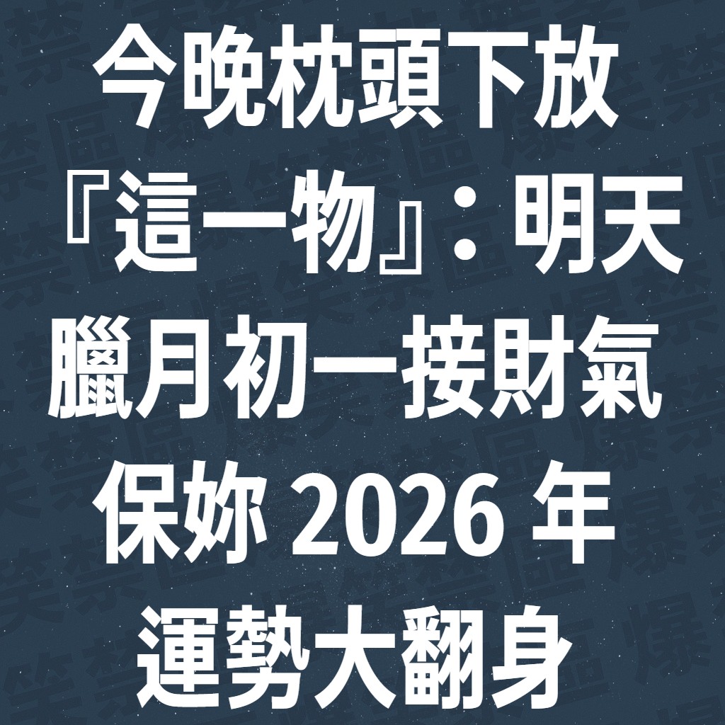 為什麼要選在今晚? 明天是臘月初一,是「土旺生金」的起點。今晚透過枕頭下的紅包進行「壓財」,能利用睡眠時人體磁場最放鬆的時刻,與臘月的土系能量接軌,保佑你在 2026 年不僅賺得到錢,更能「守得住財」,不讓意外破財找上門。