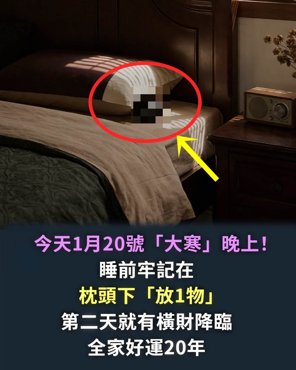 大寒是二十四節氣之末,象征冬盡春生、辭舊迎新。民俗中「枕頭下放物」的習俗,實為利用年度交接的心理節點,通過具象行為建立積極的心理暗示,從而引導思維與行動向目標靠攏。所謂「橫財」與「20年好運」,本質是正確規劃與持續行動疊加產生的長期復利效應,而非不勞而獲的奇跡。