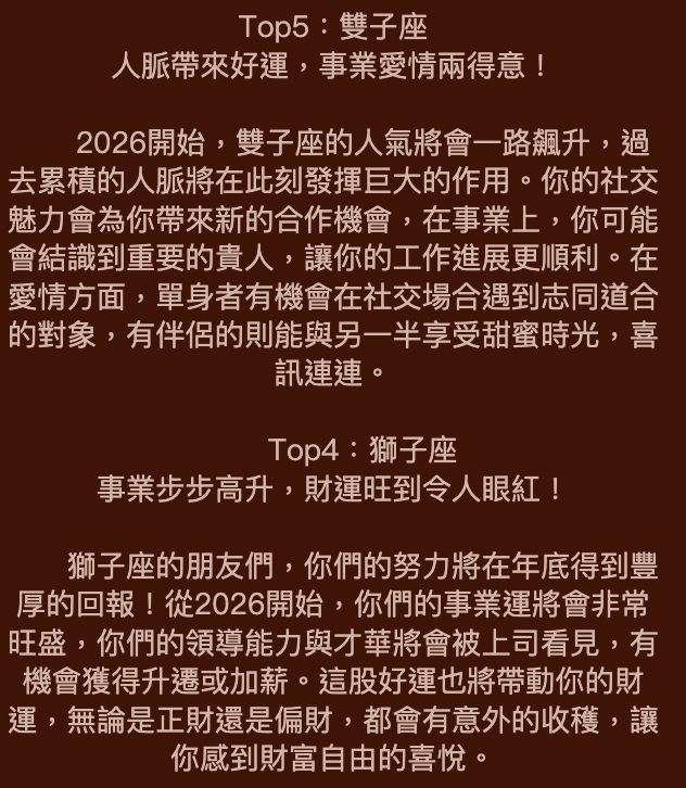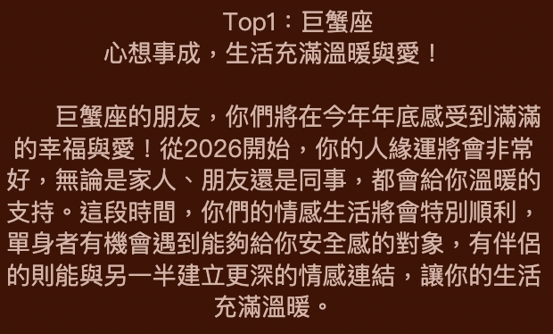 從年初開始到年底,喜訊不斷的五大星座! Posted by ALICE 21 一月, 2026 追蹤我們的threads ! 歡樂不迷路 Post by @i_lovememe520 View on Threads . . . . . . . . . . . . . . . . . . . . . . . . 想知道財運狀況嗎?免費測驗>>>>https://lihi.cc/Ozo8m 歡迎來下水道觀看更多都市傳說👉https://lihi3.cc/c5H8h 閱讀全文 (72) 為你推薦2026年「感情運超旺」的5大星座!農歷出生日決定一生命運,準的可怕!以第一眼為準,測你這輩子最不缺什麼到底哪裡有問題解除婚約後看到老公拿出的文件,淚流滿面脾氣越好的人,越容易找全!到底有幾個銀? ALICE 21 一月, 2026