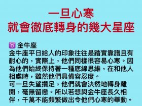 固定星座分成“主動去分、被動被分”兩種。主動分的一種是自己變心了,為投入新人懷抱,得“去除障礙才能享受美好戀情”的情況下,能沒啥留戀地說再見,雖有一絲罪惡感,但也顧不了這麼多。另一種是“受夠了所以分手”,這種也想得很透徹,對敵人心軟就是對自己殘忍,從此用“徹底斷絕”來支持自己勇敢向前飛。