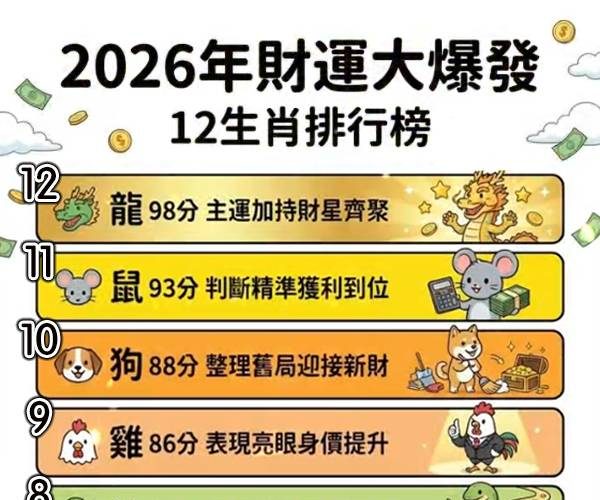 2026年財運大爆發12生肖排行榜