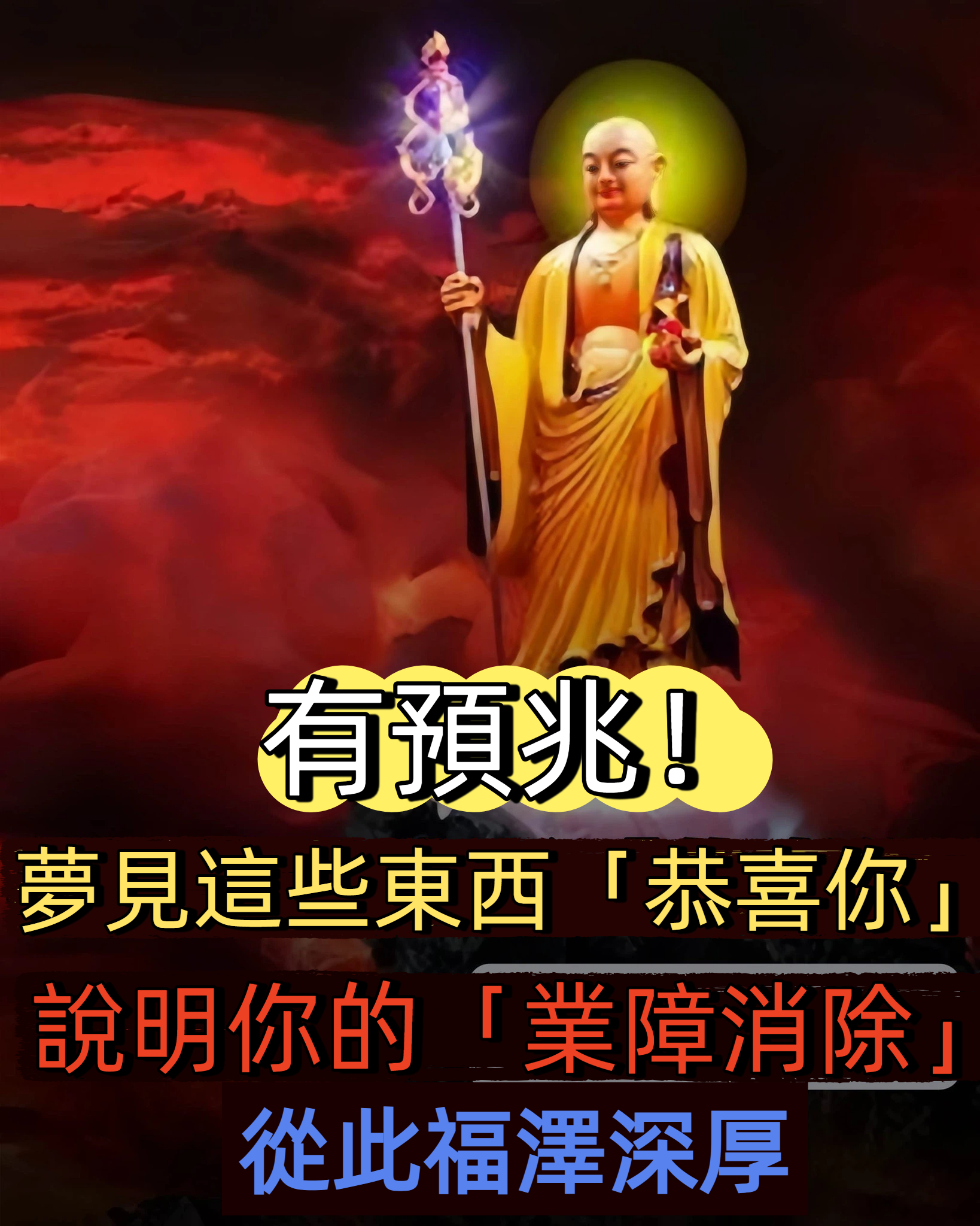 另外呢比如說夢見水,如果夢見水很清,又很大,那就更好,或者夢見自己下到水裡,更好,這都是消除都是淨除業障的標誌。還有一些比方說,夢見自己從監獄裡面逃出來,夢見渡過大河,夢見自己爬山爬到山頂,或者是夢見自己同一個黑人打架,並且還打贏了,或者夢見自己拜佛、到廟裡面,見到那個香爐在冒煙,然後到香爐那裡看,香爐裡面是空的,沒有什麼東西,這些都是屬于業障減輕的徵兆。
