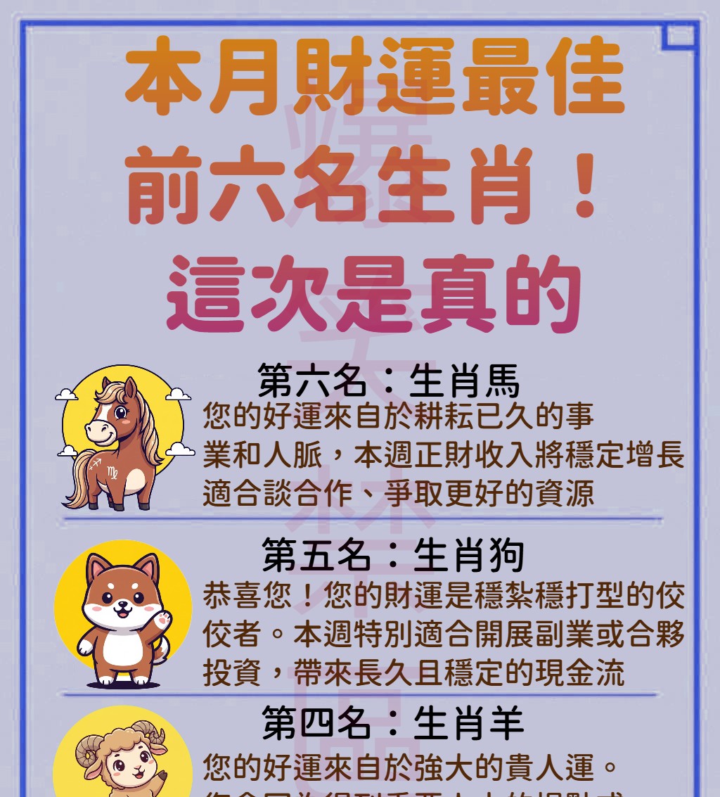 財運關鍵: 偏財大師,靈感中獎。 恭喜您進入前三強!您的偏財運超級旺盛,直覺非常靈敏。本月是小試手氣的最佳時機,無論是彩券、抽獎還是投資,都可能獲得意外的驚喜,橫財運擋不住!