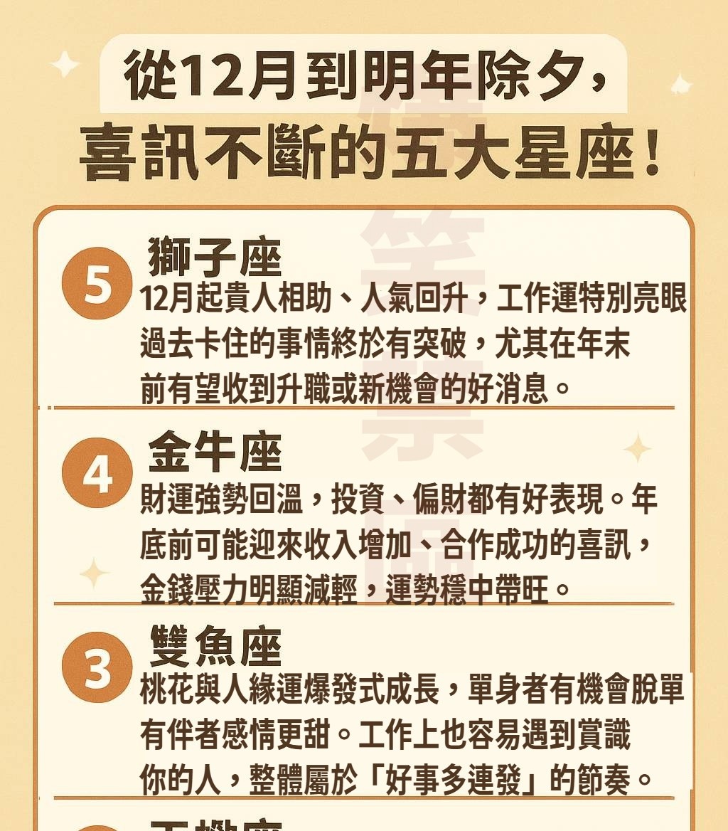 從12月開始一路旺到除夕,事業、財運、感情全面開花!摩羯將迎來重要的轉折點,不論是升遷、買房、感情確定關係,都有機會實現,是年底最閃亮的幸運王。
