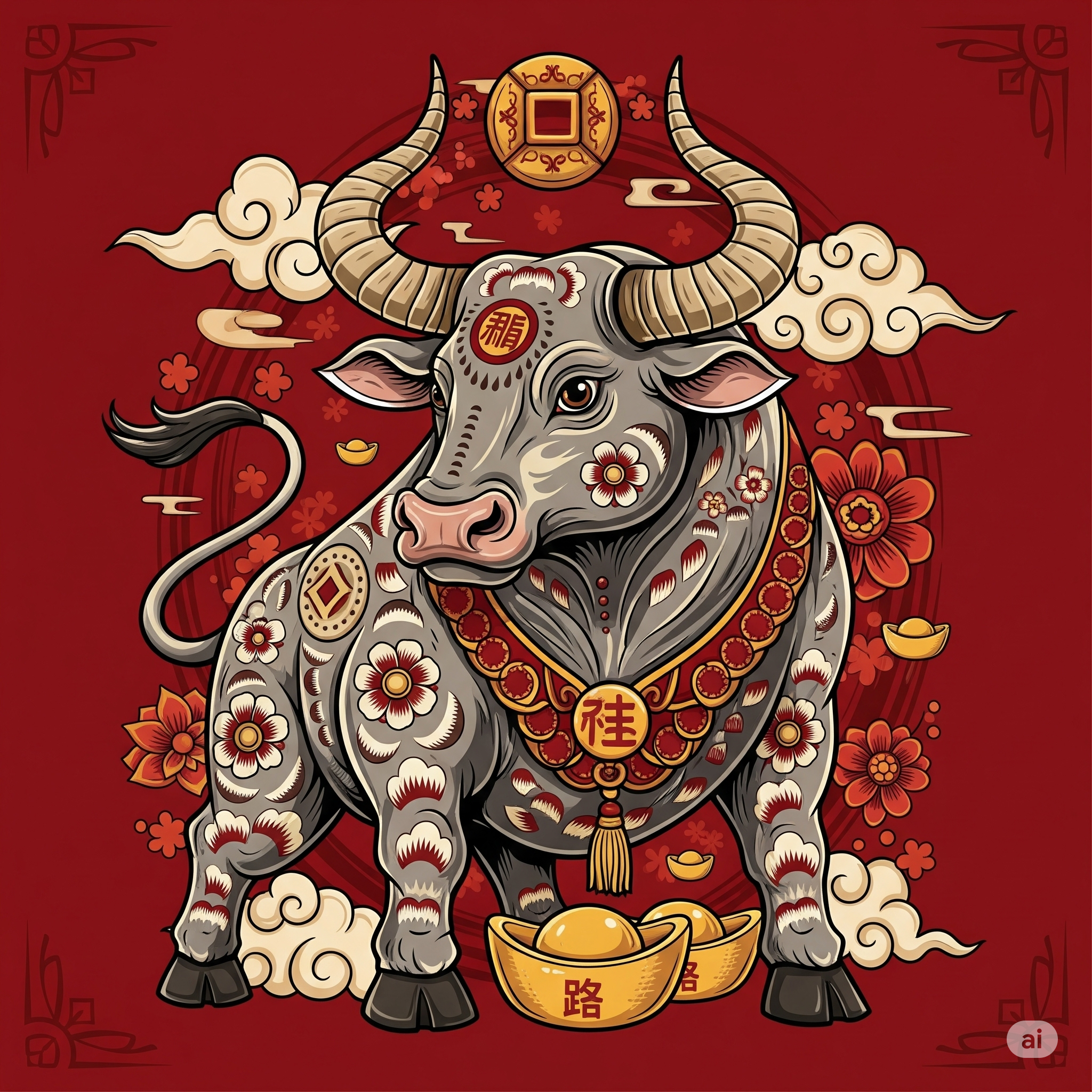 接財話: 「老牛耕地,金銀滿地,晚年大富大貴!」