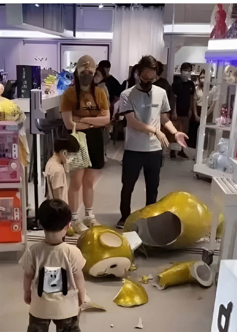 圖片中,商場櫃位前散落著破碎的金色公仔零件,場面一度十分尷尬。面對孩子如此激烈的行為,一般的家長若非當眾大聲斥責,就是因為面子問題而妥協買單,或者乾脆連拖帶拉地將孩子帶離現場。然而,這位媽媽的應對方式,卻被網友譽為「最高境界的教養」。