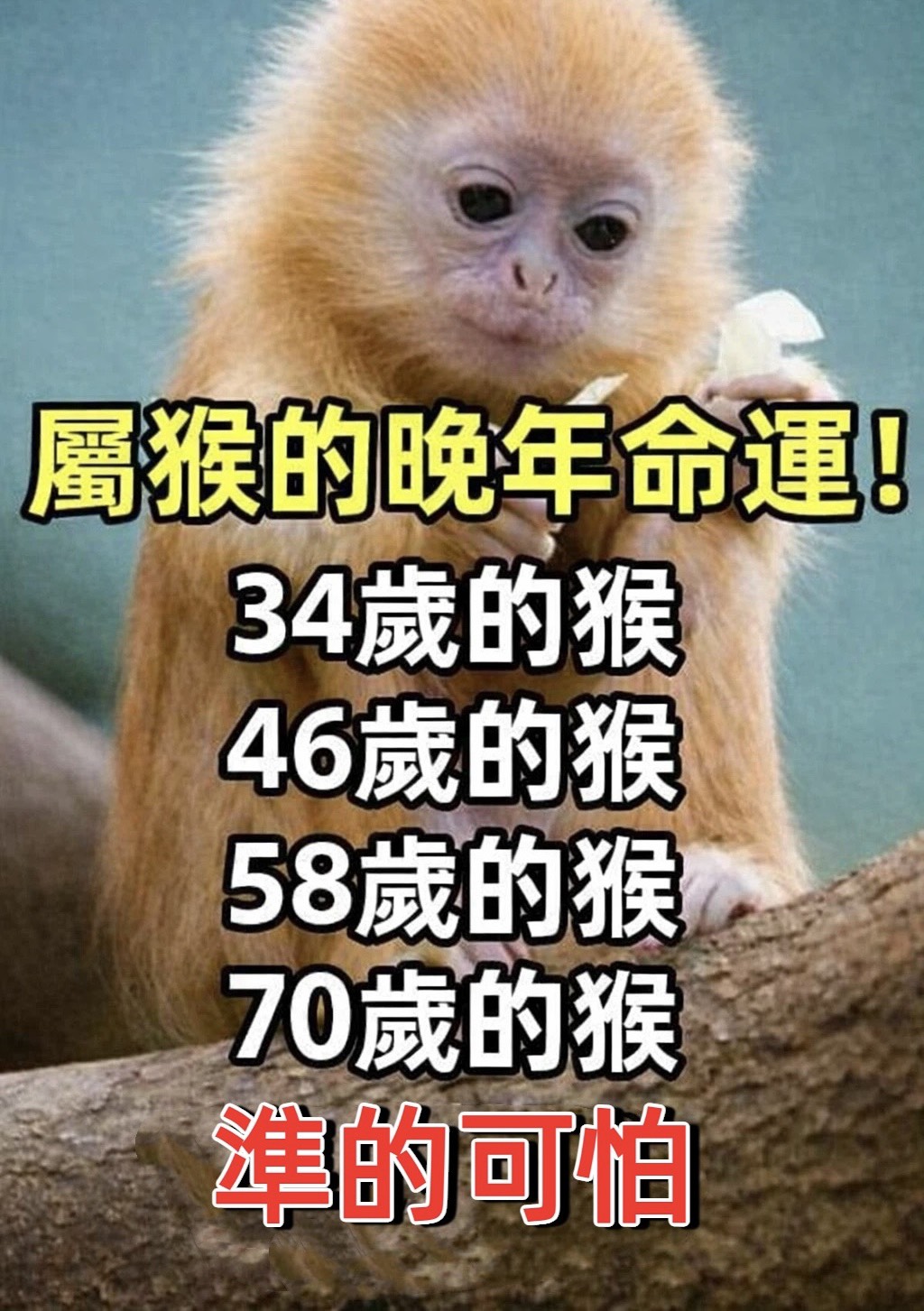 很多屬猴的人年輕時拚、衝、快,什麼都想試,但真正的「命運轉折點」,其實多半落在中年之後。下面用年齡來看,屬猴人一生最關鍵的幾個階段,尤其是晚年命運,真的準到會起雞皮疙瘩。